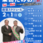 2/7(土)の街頭演説予定 (緑区)8:00 鳴海駅9:00 緑区役所10:00 マックスバリュ鳴子店11:00 野並交差点 (天白区)14:00 植田ピアゴ店前15:00 平針ピアゴ店前15:45 高坂コノミヤ店前 ( ... 続きを読む →
