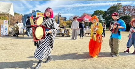 ステージ前にはシートが敷かれ、親子連れや友人同士がくつろぎながらイベントを観覧しました。ひらき座によるチンドンパフォーマンス、クイズ大会、腹話術、歌や舞踊、バンド演奏など多彩なステージが続き、観客の手拍子や歌声が会場を包みました。