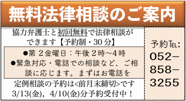 | 3/13(金)14:00- | 無料法律相談 | 昭和区委員会 |